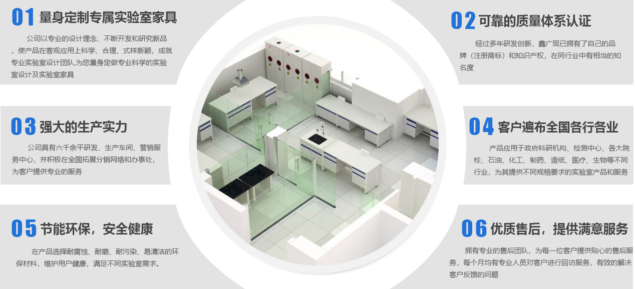 山東鑫廣實驗設備科技有限公司成立于2007年,是一家位于山東濰坊的實驗室家具工廠。作為實驗室整體解決方案服務商,我們提供從實驗室規(guī)劃、實驗室設計、實驗室裝修、實驗室工程、實驗室家具、實驗室設備、到實驗室服務等實驗室建造一站式服務,致力于專業研發(fā)、設計、生產實驗室家具等產品及相關配套設備,并提供實驗室建設全套解決方案的新型高科技企業。公司下設研發(fā)加工工廠、營銷服務中心,并積極在全國拓展分銷網絡和辦事處,為客戶提供更專業、優(yōu)良的產品和服務。